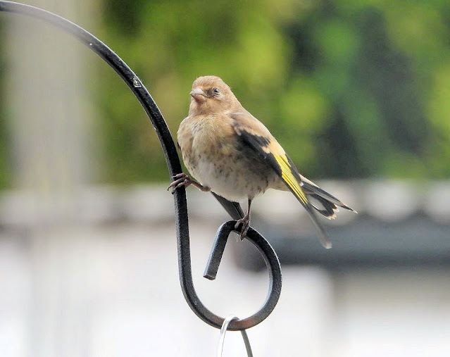 Having to be up in Oldham for 10-00 we were up early and to my surprise there in my garden were the baby Goldfinches tucking in to the Sunflower seeds, a couple of weeks ago when I first saw them this year they were being fed by their parents,
