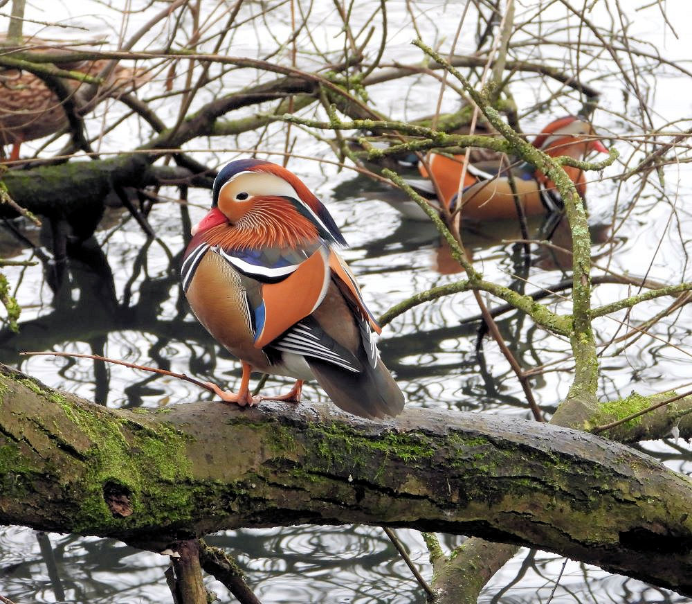 Then on the way back to the car park spotted the Mandarin ducks standing on the low branches over the water.