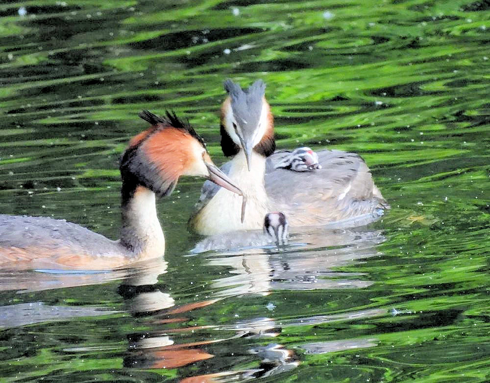 Sunday went early to McDonalds and then over to the ressers to see how the great Crested Grebes were getting on and there they were with the babies riding on mum's back!.