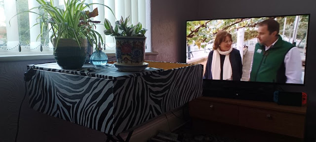 Just out of the way of the telly, Maggie Cooper on there, who we met at Pear Mill when she was making that programme there.