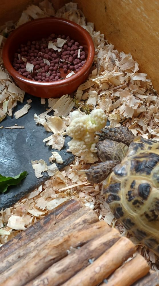Alfie does like his cauliflower, but in the mornings I just go out into the garden and cut a bunch of dandelion leaves, he likes shredded carrot, Kale and tomato, hoping to get him out into the garden soon as I've finished the log rolls edging, a job in progress!.